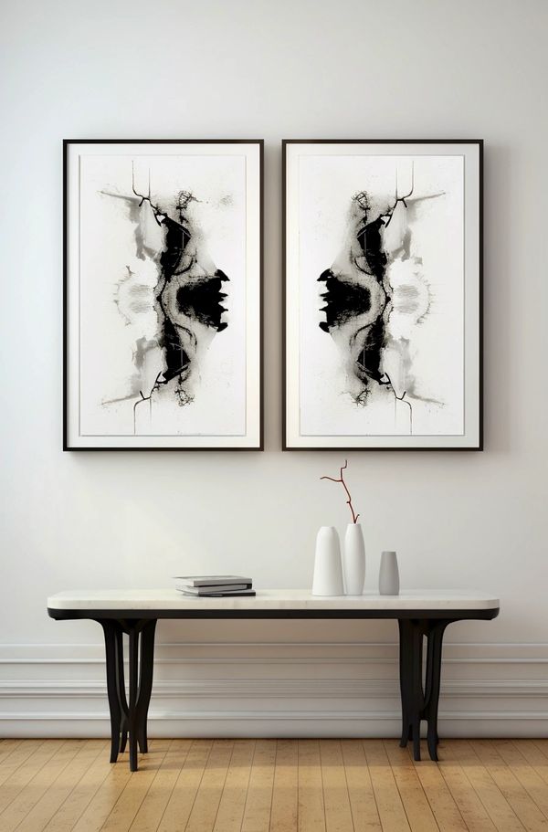 She pauses, her gaze lingering on the canvases that fill the space between us. “I see a butterfly,” she whispers, her voice filled with awe. “Its wings are open, navigating a vast sky. These canvases, connected by a shared horizon but divided by an unseen gap, feel like a window to something bigger, something unknown.”
